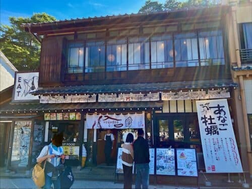 桟橋から厳島神社まで美味しそうなお店が並んでいます。